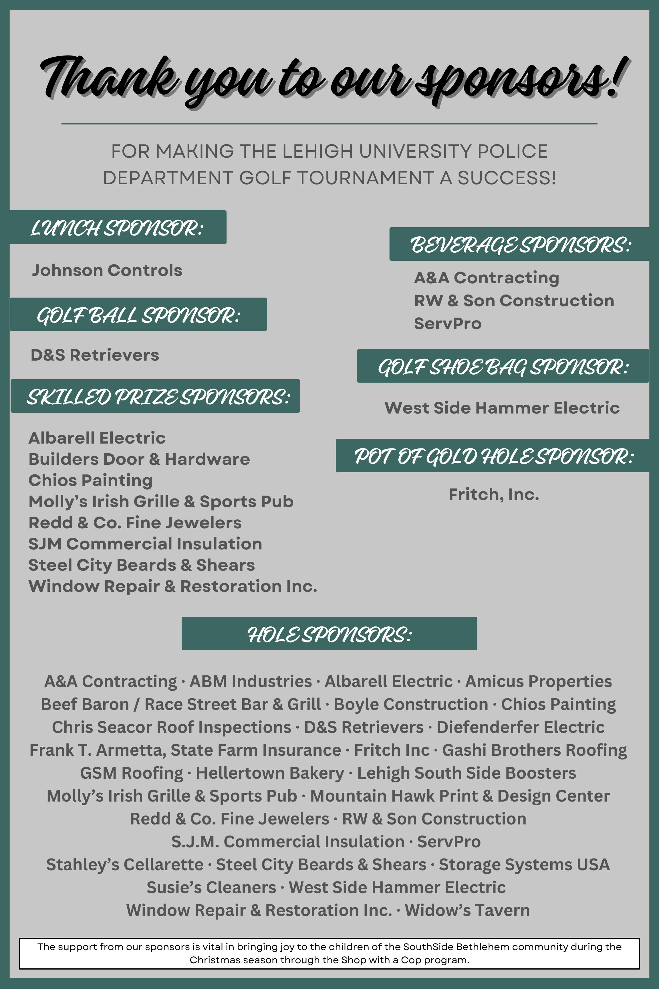 This special event supports community programs and initiatives led by the Lehigh University Police Department, including the Therapy Dog Program, Shop with a Cop, and other Lehigh and South Bethlehem-focused community events.